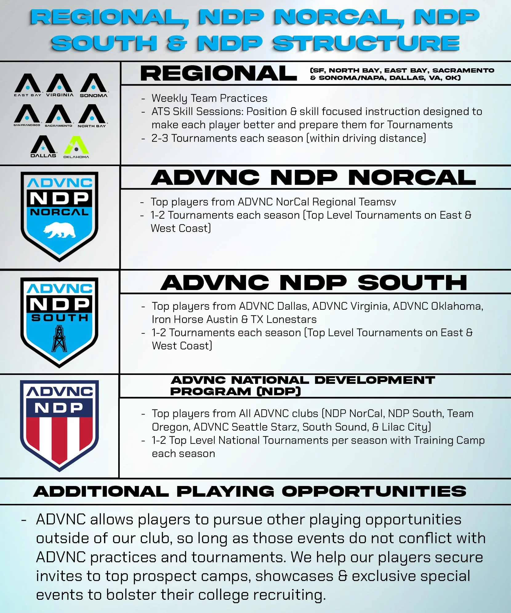 The National Development Program selects the top players from all of these teams. NDP Teams compete at the most prestigious tournaments in America.